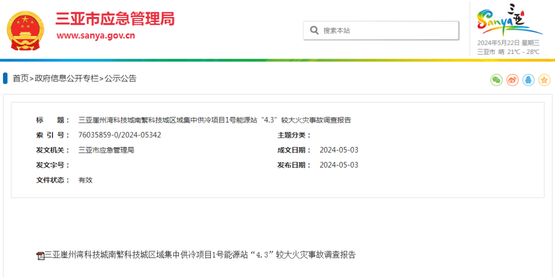 《三亚崖州湾科技城南繁科技城区域集中供冷项目1号能源站“4.3”较大火灾事故调查报告》