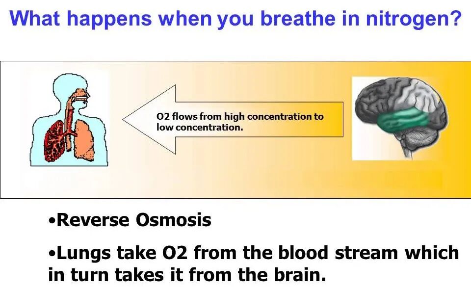 纯氮气会排除空气中的氧气,导致人体缺氧。人体对氧气浓度的变化不敏感,但对二氧化碳浓度的变化很敏感。吸入纯氮气时,体内的二氧化碳是会被正常地从肺排出的,身体的二氧化碳浓度一直处于正常状态,所以不会有窒息感。当人体吸入不含氧气的气体时,整个血液循环系统会发生非常奇怪的变化,正常情况下,红细胞在肺内获得氧气,然后将氧气运送到全身各处组织中供它们使用。但在肺部充满没有氧气,也没有二氧化碳的气体时,这一过程会逆转,红细胞会从身体的组织中抽出氧气(尤其是从脑组织中),全力支援没有氧气的肺脏,也就是说全身的氧气会被血液循环系统倒抽到肺部。
