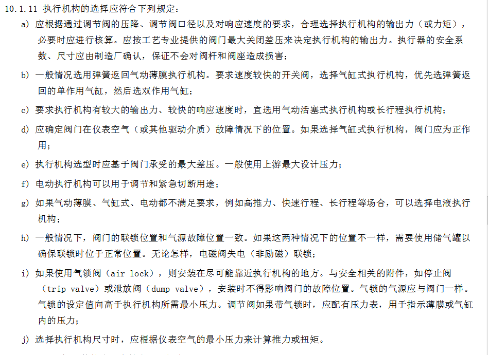首先规范条文所在目录分为:10控制阀,10.1调节阀,10.2自力式调节阀,10.3开关阀。10.1调节阀中对其执行机构有具体要求,如图(2);