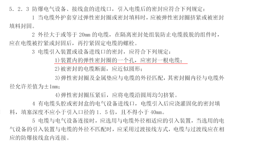 《电气装置安装工程 爆炸和火灾危险环境电气装置施工及验收规范》(GB 50257-2014)第5.2.3条 :防爆电气设备接线盒的进线口,引人电缆后的密封应符合下列规定:
