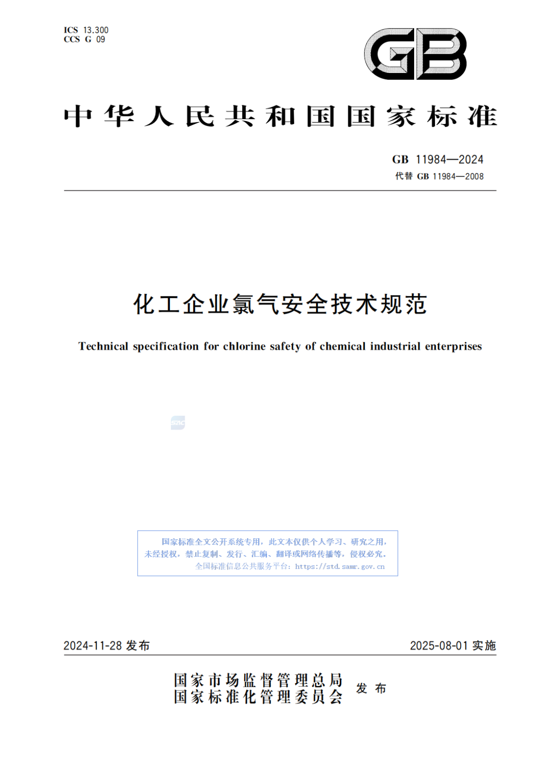 为有效管控化工企业氯气生产、储存重大安全风险,防范遏制重特大事故,应急管理部组织修订的强制性国家标准《化工企业氯气安全技术规范》(GB 11984-2024)于近期发布,自2025年8月1日起实施。